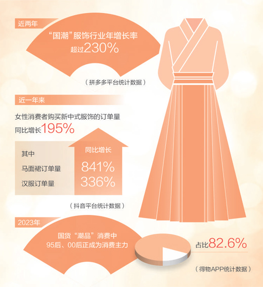 今年3月发布的《2024抖音电商女性消费趋势数据报告》显示,过去一年,该平台女性消费者购买新中式服饰的订单量同比增长195%,其中马面裙订单量同比增长841%,汉服订单量同比增长336%。